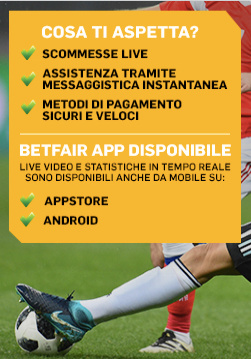 | Bonus | Rimborso del 100% sulle prime giocate fino ad un massimo di 50€. Più informazioni sul Betfair bonus. | Commissione sulle prime vincite che scende al 2%. Più informazioni sul Betflag bonus. |